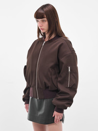 A brown bomber jacket in padded wool with a cropped oversized silhouette, contrasted by ribbed edges and functional pockets. The dropped shoulders emphasize its slouched structure. Featuring: • Oversized fit • Padded construction • Ribbed stand collar • Front zip closure • Dropped shoulders and long sleeves • Rib-knit cuffs and hem • Zip pocket at sleeve • Side flap pockets • Quilted lining • Cropped length • 100% Wool • Standard sizing Model is 5'7" wearing size S. Bust: 30" Waist: 22" Hips: 33"