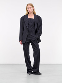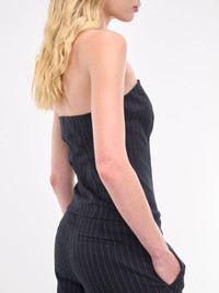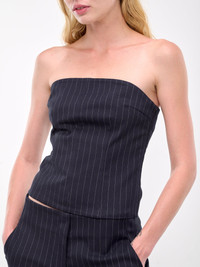 ENTIRE STUDIOS top in navy, paneled construction, pinstripe pattern, straight neckline, strapless, side concealed zip closure, straight hem, slim fit. Standard Sizing Model is 5'8" wearing size S. Bust: 31" Waist: 23.5" Hips: 34"
