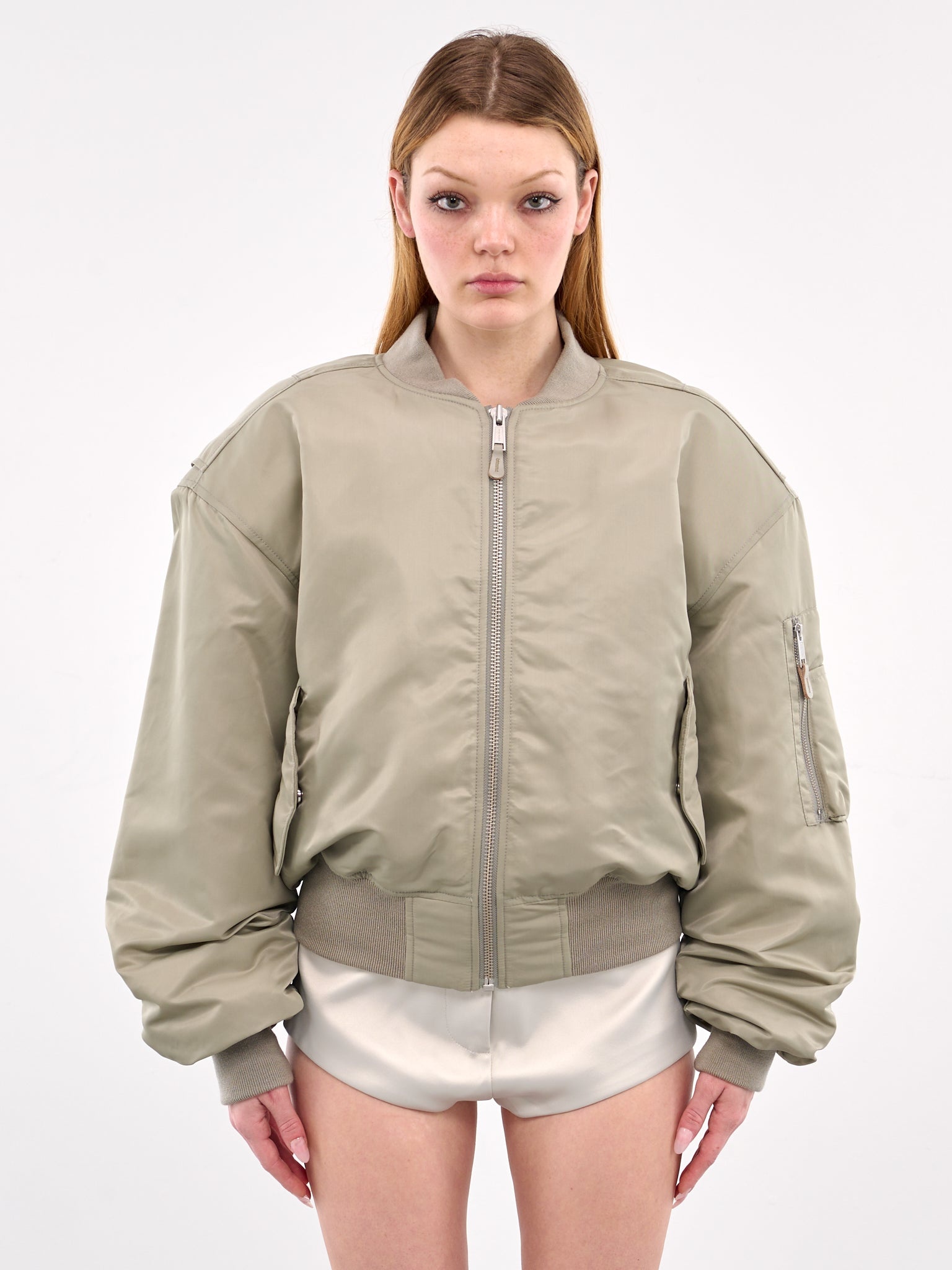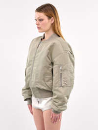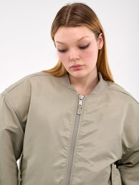 ENTIRE STUDIOS jacket in beige, paneled construction, ribbed stand collar, front exposed zip closure, dropped shoulders, long sleeves, rib-knit cuffs & hem, side buttoned flap pockets, straight hem, oversized fit. Standard Sizing Model is 5'7" wearing size S. Bust: 30" Waist: 23" Hips: 34"