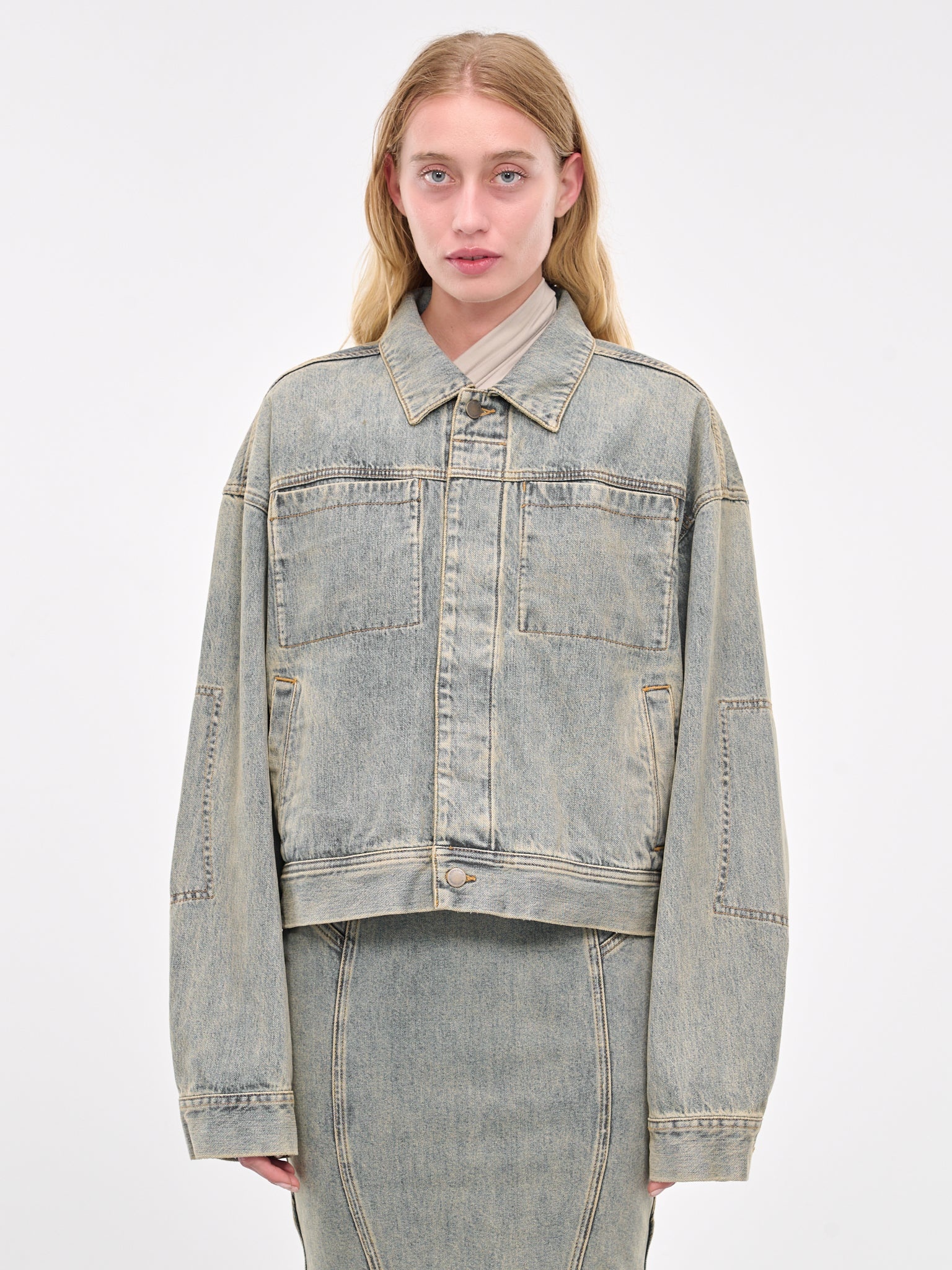 ENTIRE STUDIOS jacket in light blue, paneled denim construction, spread collar, front buttoned placket closure, long sleeves, buttoned barrel cuffs, chest welt pockets, side welt pockets, hem adjustable strap, straight hem, oversized fit. Standard Sizing Model is 5'8" wearing size S. Bust: 31" Waist: 23.5" Hips: 34"