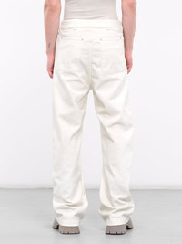 ENTIRE STUDIOS trousers in white, paneled denim construction, belt loops, back logo patch, front concealed zip fly closure, inset pockets, back patch pockets, straight leg, loose fit. Standard Sizing Model is 6’1” wearing size M. Shoulders: 19” Chest: 38” Waist: 31”