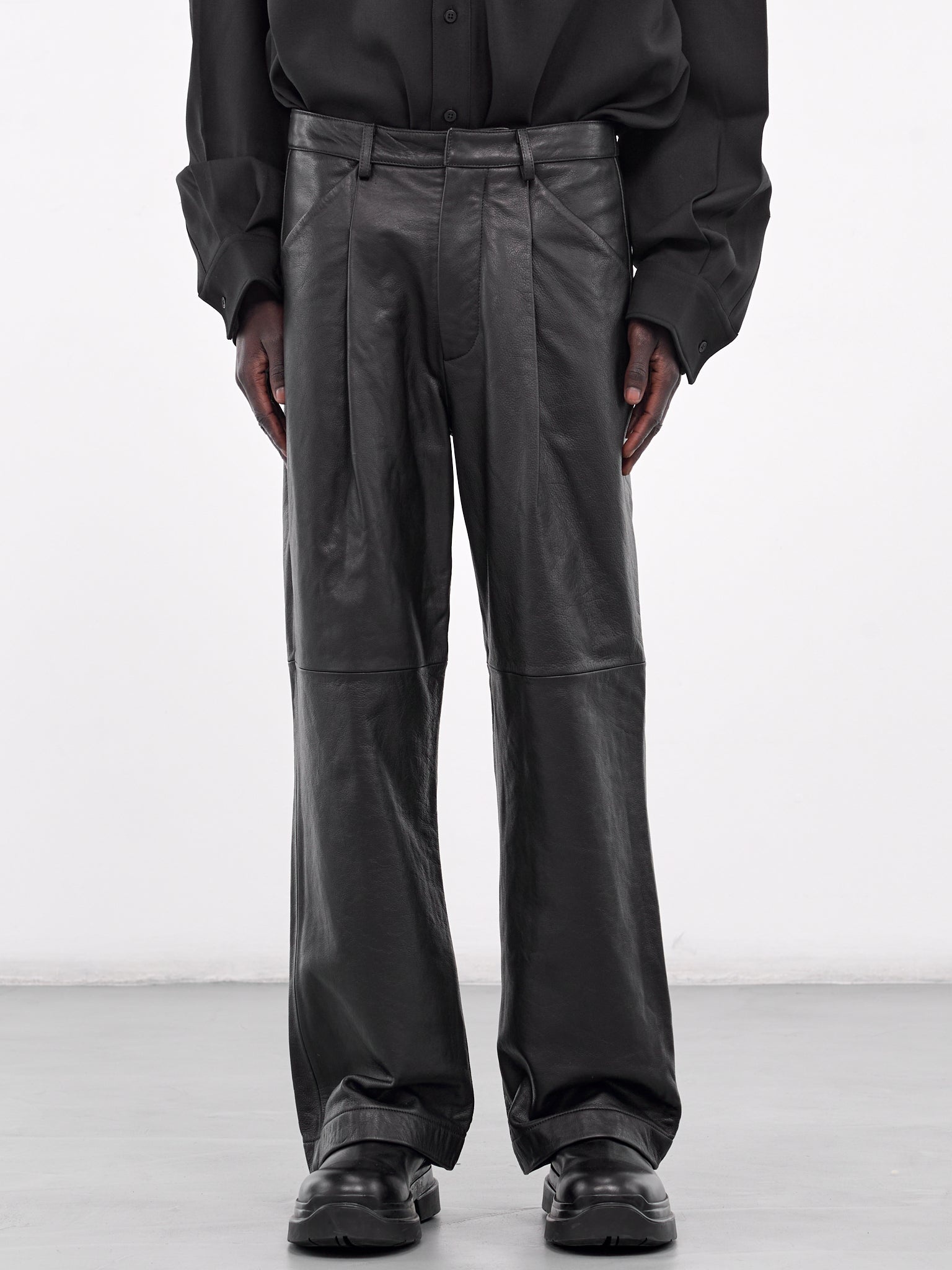 ENTIRE STUDIOS pants in black, paneled leather construction, belt loops, front concealed zip fly closure, pleated, inset pockets, back buttoned flap pockets, flared leg, regular fit. Standard Sizing Model is 5'11.5" wearing size M. Shoulders: 16" Chest: 32.5" Waist: 30"