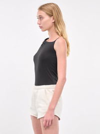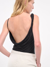 ENTIRE STUDIOS bodysuit in soot, paneled construction, asymmetric neckline, spaghetti strap & twisted strap, sleeveless, armscyes, open back, back draping, high-cut, form fit. Standard Sizing Model is 5'8" wearing size S. Bust: 31" Waist: 23.5" Hips: 34"