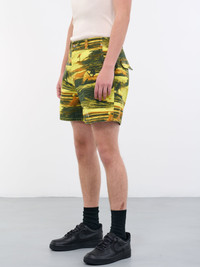 ERL shorts in yellow green, canvas construction, printed artwork, contrast topstitching, mid-waist, belt loops, adjustable side buckle fastening, button & zip-fly, side slant & back flap pockets, short length, regular fit. Standard Sizing 100% Cotton Model is 6’1” wearing size M. Shoulders: 18” Chest: 36” Waist: 28”