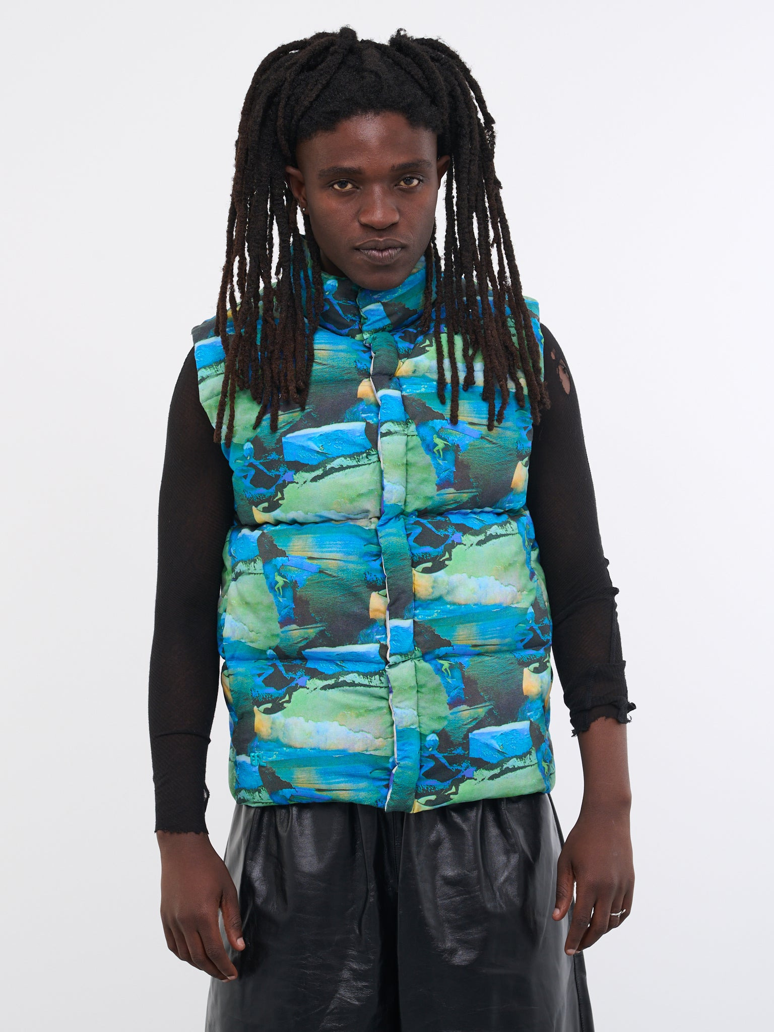 ERL vest in blue green, quilted puffer design, sunset surf print, stand collar, snap button closure, side pockets, regular fit, gender-neutral. Made in Turkey Standard Sizing Shell - 100% Cotton Filling - 100% Polyester Model is 6’0” wearing size M. Shoulders: 18” Chest: 33” Waist: 28”
