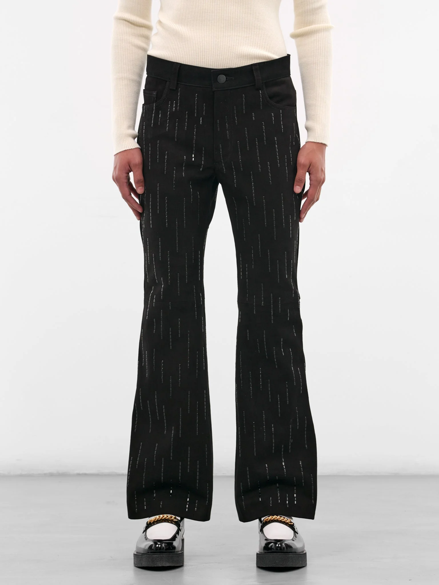 Featuring: • Slim fit • Suede construction • Hand-embellished black stones • Belt loops • Front button and zip fly closure • Five-pocket styling • Flared leg • Made in Portugal • Main: 100% Suede | Attachment: 100% Black Stones • Standard sizing Model is 6'1" wearing size M. Shoulders: 19" Chest: 38" Waist: 28"