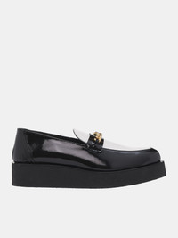 ERNEST W. BAKER shoes in black & white, creeper loafer design, calf leather construction, low-top, slip-on style, contrast vamp, gold-tone chain detailing, platform creeper sole, lined. Made in Portugal 100% Calf Leather European Sizing
