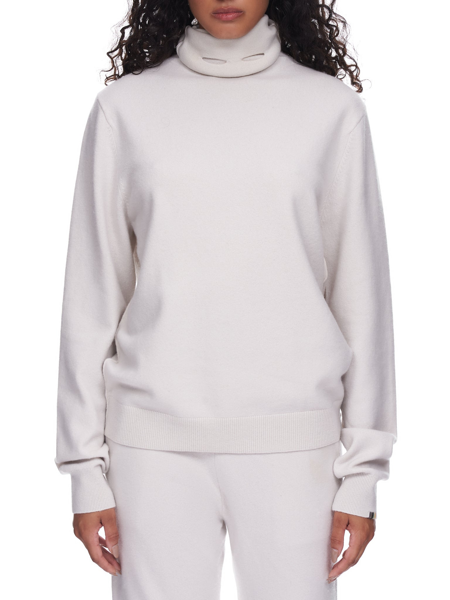 Extreme Cashmere roll neck sweater in chalk. Comfort fit, roll neck mask, rib knitted at cuffs & hem, extra button on left side for a drape effect, unisex. Imported One Size Composition: 88% Cashmere, 10% Nylon, 2% Elastane Model is 5ft 9” and is wearing a size OS. Bust: 32” Waist: 24.5” Hip: 35.5"
