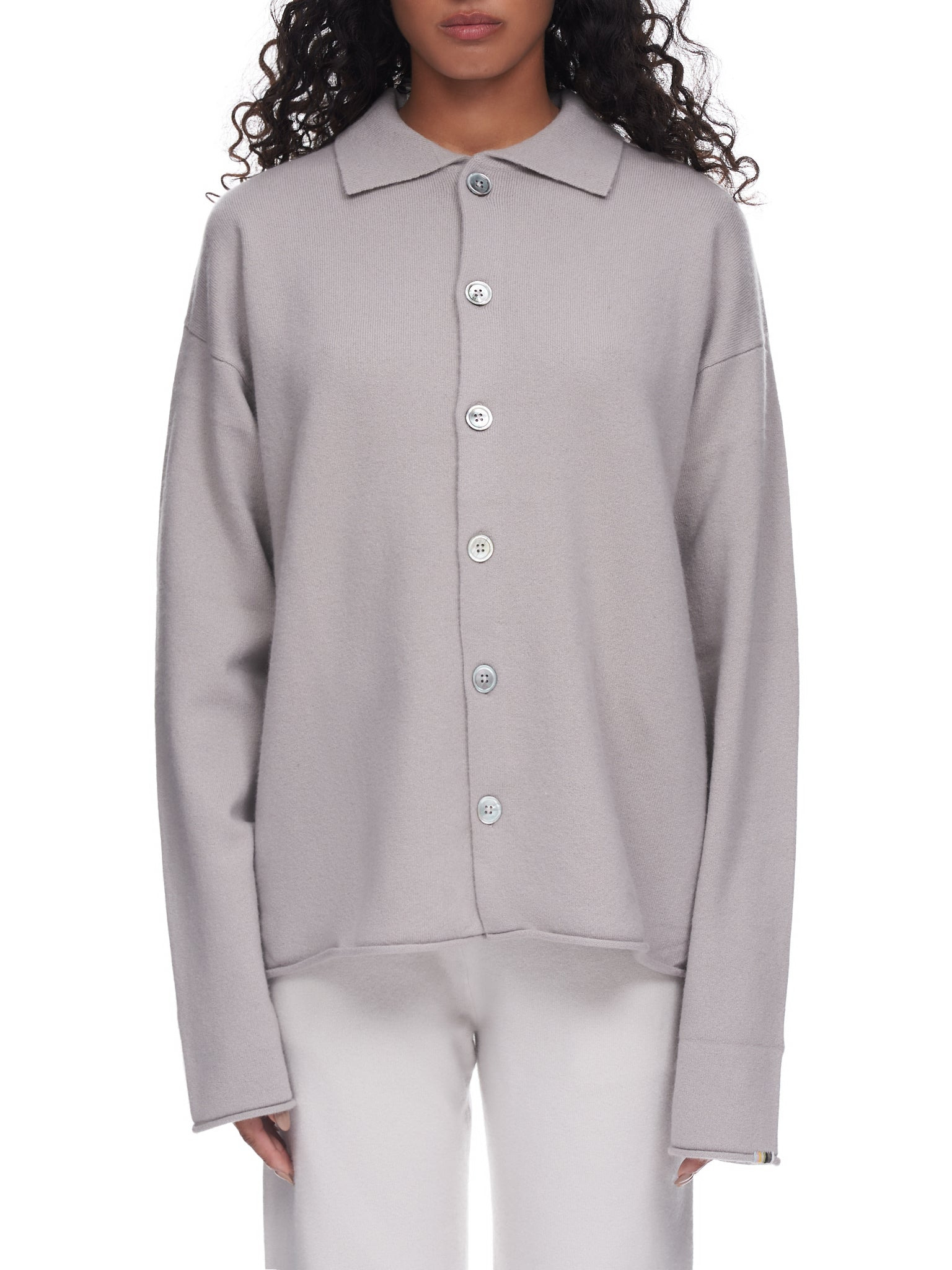 Extreme Cashmere cardigan sweater in vintage. Comfort fit, pointed collar, mother of pearl buttons, dropped shoulders, rolled edge cuffs & hem, unisex, relaxed fit. Imported One Size Composition: 100% Cashmere Model is 5ft 9” and is wearing a size OS. Bust: 32” Waist: 24.5” Hip: 35.5"