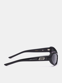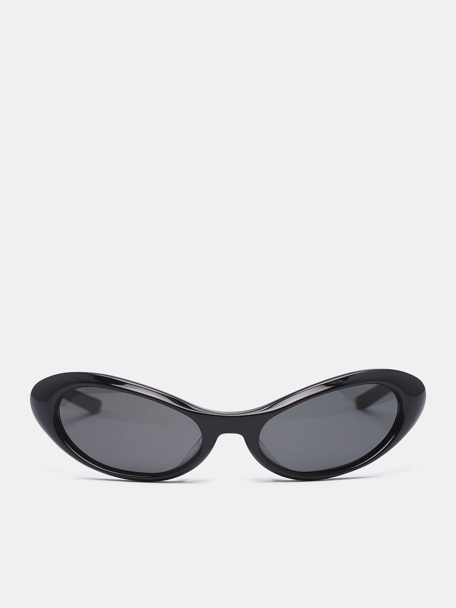 GENTLE MONSTER sunglasses in black, acetate construction, glossy finish, cat eye frames, fixed nose pads, grey-tinted lenses, side logo detailing, case included. Acetate One Size