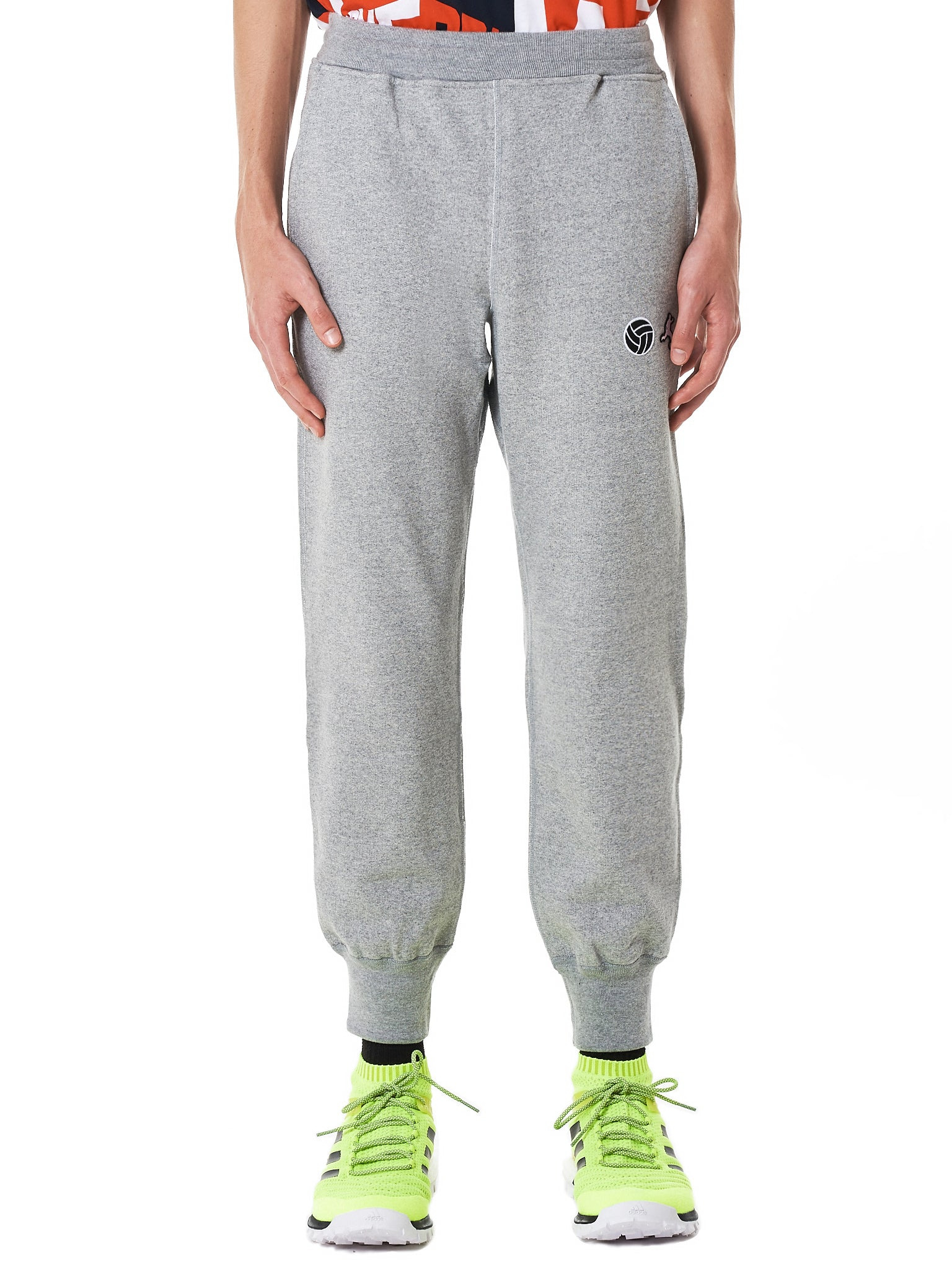 Gosha Rubchinskiy combed knit jogger in heather grey, embroidered “ball and player” logo at leg, mid-waist rise, elasticized waistband, three-pocket construction, rib-knit bottom hem, tonal stitching. Made in Japan. Composition - 100% Cotton Model Measurements: Model is 6ft 1” and wearing a size S. Shoulders: 16” Chest: 34” Waist: 29”