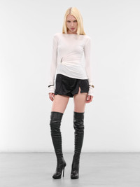 A white jersey top featuring gathered draping anchored by silver-tone claw hardware. The wide neckline and soft stretch bring tension between fluidity and structure. Featuring: • Slim fit • Jersey construction • Wide neck • Long sleeves • Silver-tone claw hardware at front with draping and gathering • Made in USA • 92% Polyester 8% Elastane • French sizing Model is 5'9" wearing size 36. Bust: 32" Waist: 25" Hips: 34"