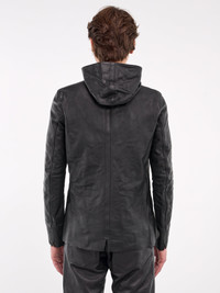 GUIDI jacket in black, paneled horse leather construction, high neck, hood, front exposed two-way zip closure, long sleeves, inset pockets, straight hem, slim fit. Made in Italy 100% Horse Leather European Sizing Model is 6'2" wearing size 50. Shoulders: 19" Chest: 38" Waist: 31"