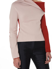 Haider Ackermann knit dualtone sweater in red and nude, asymmetric shoulder cut construction, tucked should drape detail, straight hem, tonal stitching. Made in Italy. Composition - 83% Viscose, 17% Polyester Model wears a size S.