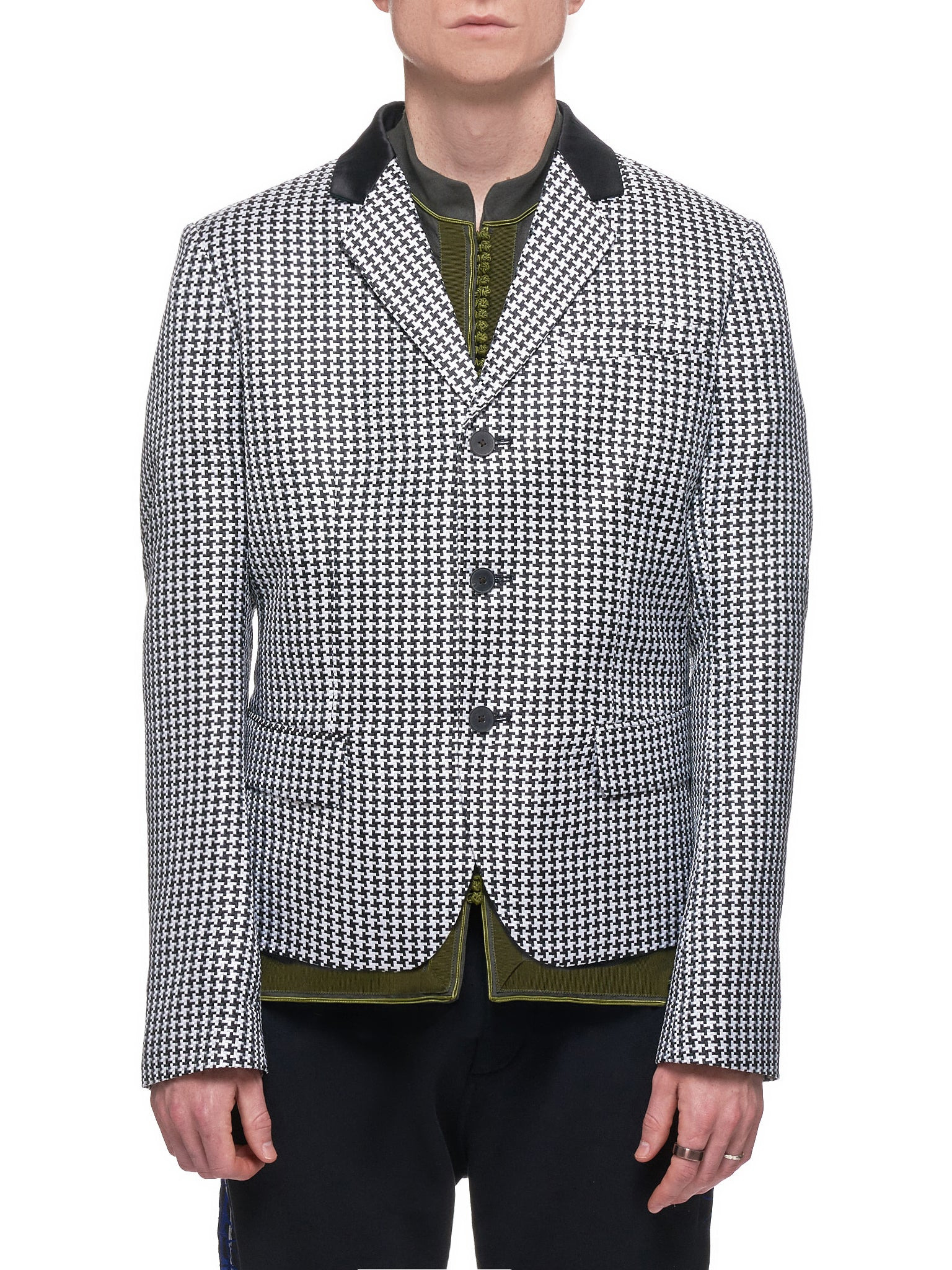 Haider Ackermann blazer in black/white, all-over houndstooth pattern, notch lapels, front button closure, flap hand pockets, structured shoulders, center back seam, straight/finished hem, tonal stitching. Made in Italy. Composition - 52% Polyester, 48% Silk Model is 5ft 11” and wearing a size 50. Shoulders: 18” Chest: 36” Waist: 29”