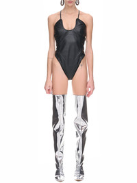 HAN KJØBENHAVN bodysuit in black, leather construction, front cut-out, seam detailing, adjustable criss-cross straps, back zip closure, lined, fitted. Italian Sizing Body - 100% Lamb Leather Lining - Recycled Polyester Model is 5'9" wearing size 36. Bust: 33" Waist: 24" Hip: 33"