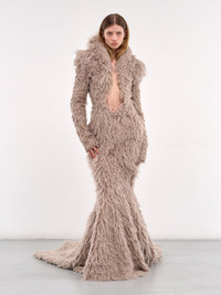 HAN KJOBENHAVN dress in beige, exclusive runway piece, paneled faux fur construction, long pile, high shawl collar, back exposed zip closure & circular zip pull, deep plunged neckline, structured shoulders, elongated sleeves, flared below knee, elongated circular train, floor-length, tailored fit. One Size Model is 5'9" wearing size OS. Bust: 32" Waist: 23" Hips: 34"
