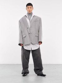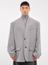 HED MAYNER jacket in light grey, blazer design, paneled construction, stand collar, lapelless, v-neck, structured shoulders, long sleeves, surgeon's cuffs, front button closure, chest welt pocket, side flap pockets, straight hem, oversized fit. Standard Sizing Model is 6'1" wearing size M. Shoulders: 18" Chest: 36" Waist: 28"