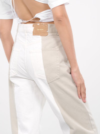 HODAKOVA beige & white trousers, paneled denim construction, belt loops, button & concealed zip fly, back logo jacron, inset pockets, back asymmetric patch pockets, tapered leg, slim fit. Made in Sweden 100% Cotton Standard Sizing Model is 5'8" wearing size S. Bust: 32" Waist: 26" Hips: 34.5"