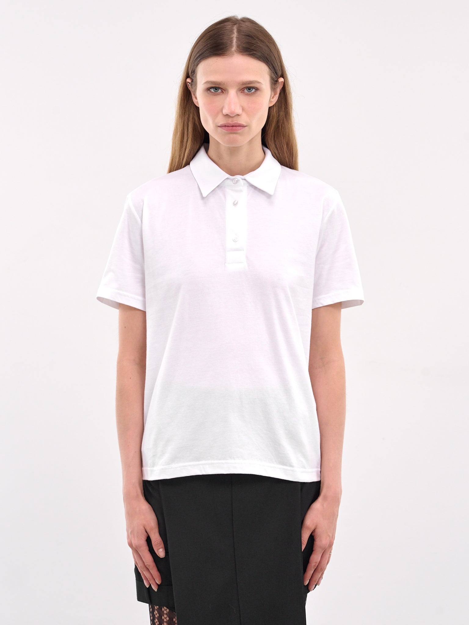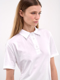 HODAKOVA polo in white, paneled cotton construction, pointed collar, front quarter button placket closure, short sleeves, straight hem, slim fit. Made in Sweden 100% Cotton Standard Sizing Model is 5'9" wearing size S. Bust: 32" Waist: 23" Hips: 34"