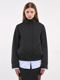 HODAKOVA jacket in black, deconstructed upside-down suit pants design, wool-poly blend, paneled construction, stand collar, collar button fastening front concealed placket closure, long sleeves, cuffs & hem deconstructed waistband detailing, straight hem, relaxed fit. Made in Sweden 60% Wool 38% Polyester 2% Elastane Standard Sizing Model is 5'9" wearing size XS. Bust: 32" Waist: 23" Hips: 34"