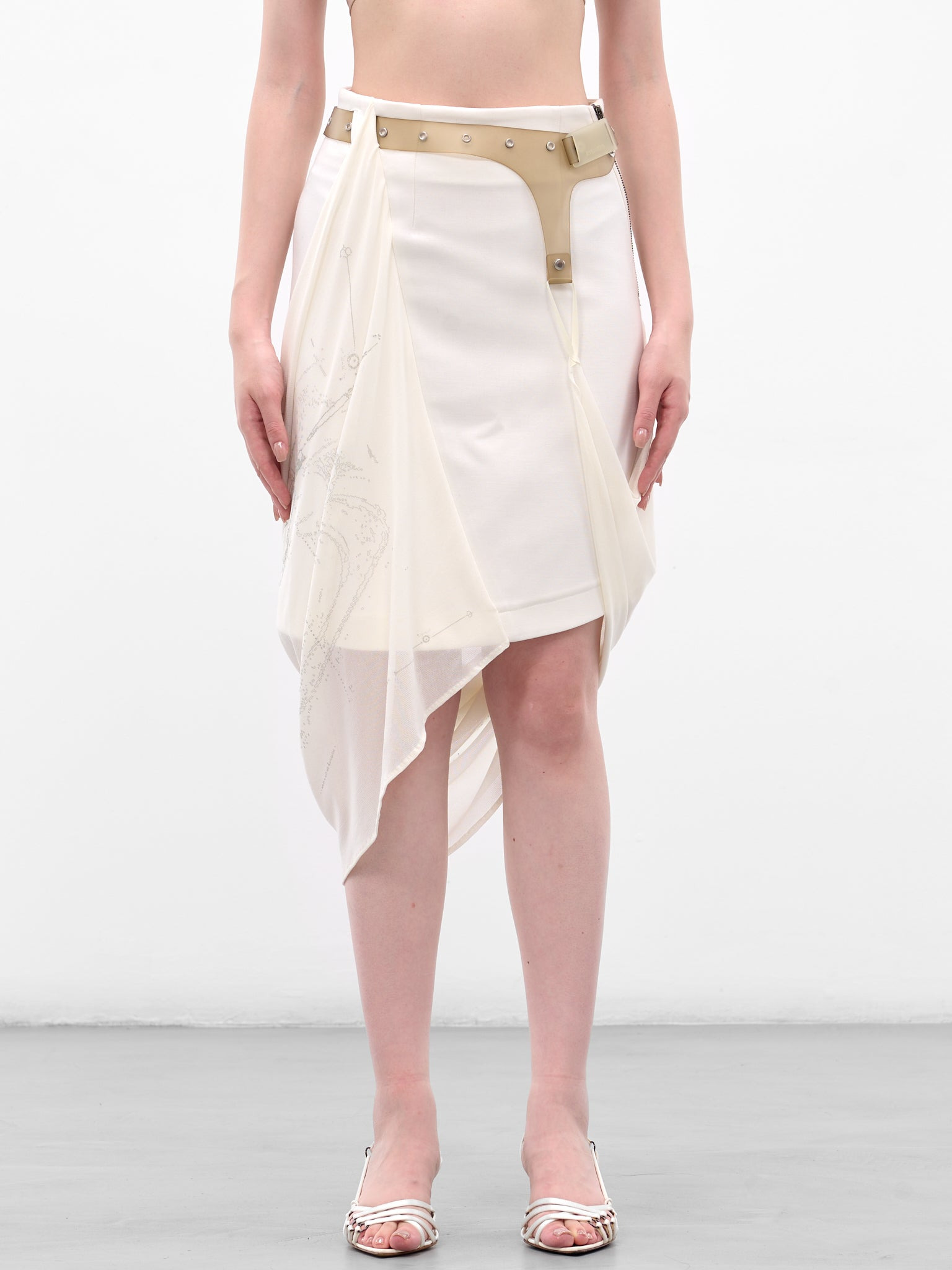 This white Hyein Seo mini skirt features a complex, layered construction with a subtle graphic print. An integrated TPU garter belt and asymmetric draped hem give the piece a signature, deconstructed edge. Featuring: • Slim fit • Layered construction with an integrated garter belt • High-waisted wrap design with a graphic print • Asymmetric draped hem and mini length • Waist belt with snap-button fastening • Side zip closure • Made in South Korea • Main: 60% Polyester 17% Tencel 13% Rayon 8% Wool 2% Spandex | Secondary: 100% Nylon | Garter Belt: 100% TPU • Numeric sizing Model is 5'7" wearing size 1. Bust: 30" Waist: 24" Hips: 35"