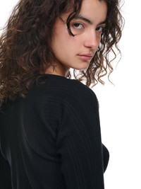 IOANNES sweater in black, rib knit, v-neck, toggle closure, open design, elongated sleeves, waist length, slim fit. Made in Italy Standard Sizing 100% Viscose Model is 5'9" wearing size S. Bust: 30" Waist: 24" Hip: 34"