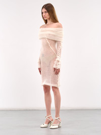 IOANNES dress in cream, paneled mohair-silk knit construction, sheer, off-shoulder, straight neckline, draped neck & shoulders, elongated sleeves, straight hem, mini-length, slim fit. Made in UK 70% Mohair 30% Silk Standard Sizing Model is 5'9" wearing size S. Bust: 32" Waist: 23" Hips: 34"