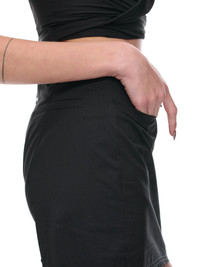 IOANNES skirt in black, crumpled twill, mid-waist, belt loops, hook & eye zip-fly, back welt pocket, mini length, slim fit. Made in France Italian Sizing Model is 5'10" wearing size 36. Bust: 32" Waist: 25" Hips: 35"