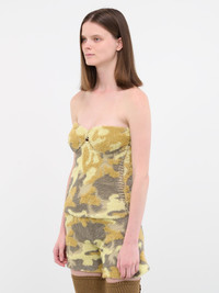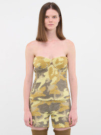 ISA BOULDER top in yellow, one-of-a-kind, hand-made, bustier design, stretch knit construction, camouflage pattern, cut-out details, sweetheart neckline, fitted. Made in Indonesia Standard Sizing Model is 5'7" wearing size S. Bust: 32" Waist: 25" Hip: 37"