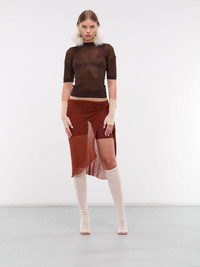 ISA BOULDER top in brown, paneled rayon knit construction, semi-sheer, rib-knit, crewneck, short sleeves, straight hem, cropped length, slim fit. Made in Indonesia 100% Rayon Standard Sizing Model is 5'10" wearing size S. Bust: 33" Waist: 23.5" Hips: 35.5"