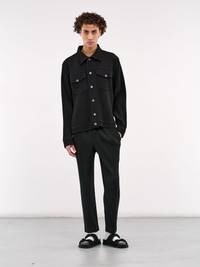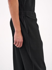 HOMME PLISSE ISSEY MIYAKE pants in black, signature pleated design, paneled polyester construction, all-over pleating, elasticated waistband, belt loops, front concealed button fly closure, side pockets, cropped length, tapered leg, relaxed fit. Made in Japan 100% Polyester Japanese Sizing Model is 6'2" wearing size 2. Shoulders: 19" Chest: 38" Waist: 29"