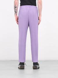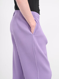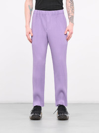 HOMME PLISSÉ ISSEY MIYAKE lilac pants, signature pleated design, polyester construction, elasticated waistband, belt loops, concealed button-fly, side seam pockets, tapered leg, slim fit. Made in Japan 100% Polyester Japanese Sizing Model is 6’0” wearing size 2. Shoulders: 19" Chest: 38” Waist: 30”