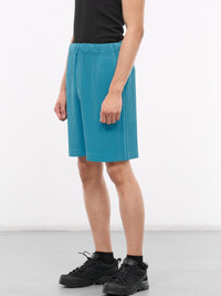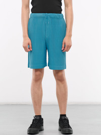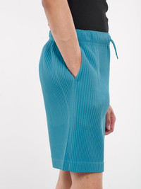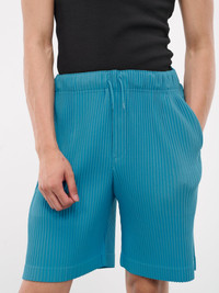 HOMME PLISSE ISSEY MIYAKE shorts in turquoise, signature pleated design, paneled polyester construction, elasticated waistband, adjustable drawstring, front concealed button fly closure, side pockets, straight hem, above-knee length, regular fit. Made in Japan 100% Polyester Japanese Sizing Model is 6'2" wearing size 2. Shoulders: 19" Chest: 38" Waist: 28"