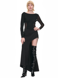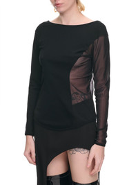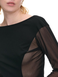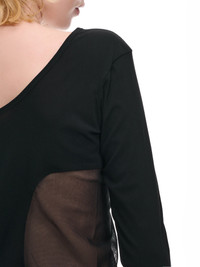 ISSEY MIYAKE top in black, mesh panels, semi-sheer, wide round neckline, scoop back, long sleeves, curved hem, slim fit. Made in Japan Japanese Sizing Body - 90% Nylon, 10% Polyurethane Second - 100% Polyester Model is 5'7" wearing size 2. Bust: 32" Waist: 25" Hip: 37"