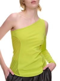 ISSEY MIYAKE top in lime green, mesh panels, semi-sheer, shoulder cut-out, one-sleeve, curved hem, slim fit. Made in Japan Japanese Sizing Body - 90% Nylon, 10% Polyurethane Second - 100% Polyester Model is 5'7" wearing size 2. Bust: 32" Waist: 25" Hip: 37"