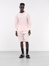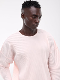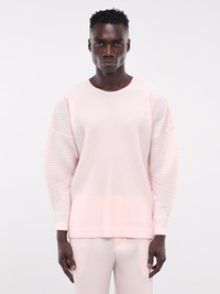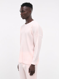 HOMME PLISSE ISSEY MIYAKE t-shirt in pale pink, signature pleated design, paneled poly construction, pleating throughout, crewneck, long sleeves, curved sleeves, straight hem, regular fit. Made in Japan 100% Polyester Japanese Sizing Model is 5'11" wearing size 3. Shoulders: 19" Chest: 38" Waist: 30"
