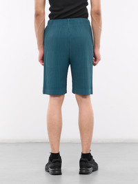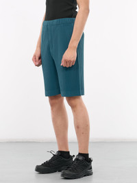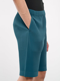 HOMME PLISSE ISSEY MIYAKE shorts in teal, signature pleated design, paneled polyester construction, elasticated waistband, front concealed button fly closure, side pockets, straight hem, above-knee length, regular fit. Made in Japan 100% Polyester Japanese Sizing Model is 6'2" wearing size 2. Shoulders: 19" Chest: 38" Waist: 28"