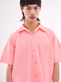 HOMME PLISSE ISSEY MIYAKE shirt in pink, paneled poly construction, signature pleated design, spread collar, front button placket closure, short sleeves, side vents, straight hem, relaxed fit. Made in Japan 100% Polyester Japanese Sizing Model is 6'1" wearing size 2. Shoulders: 18" Chest: 36" Waist: 30"