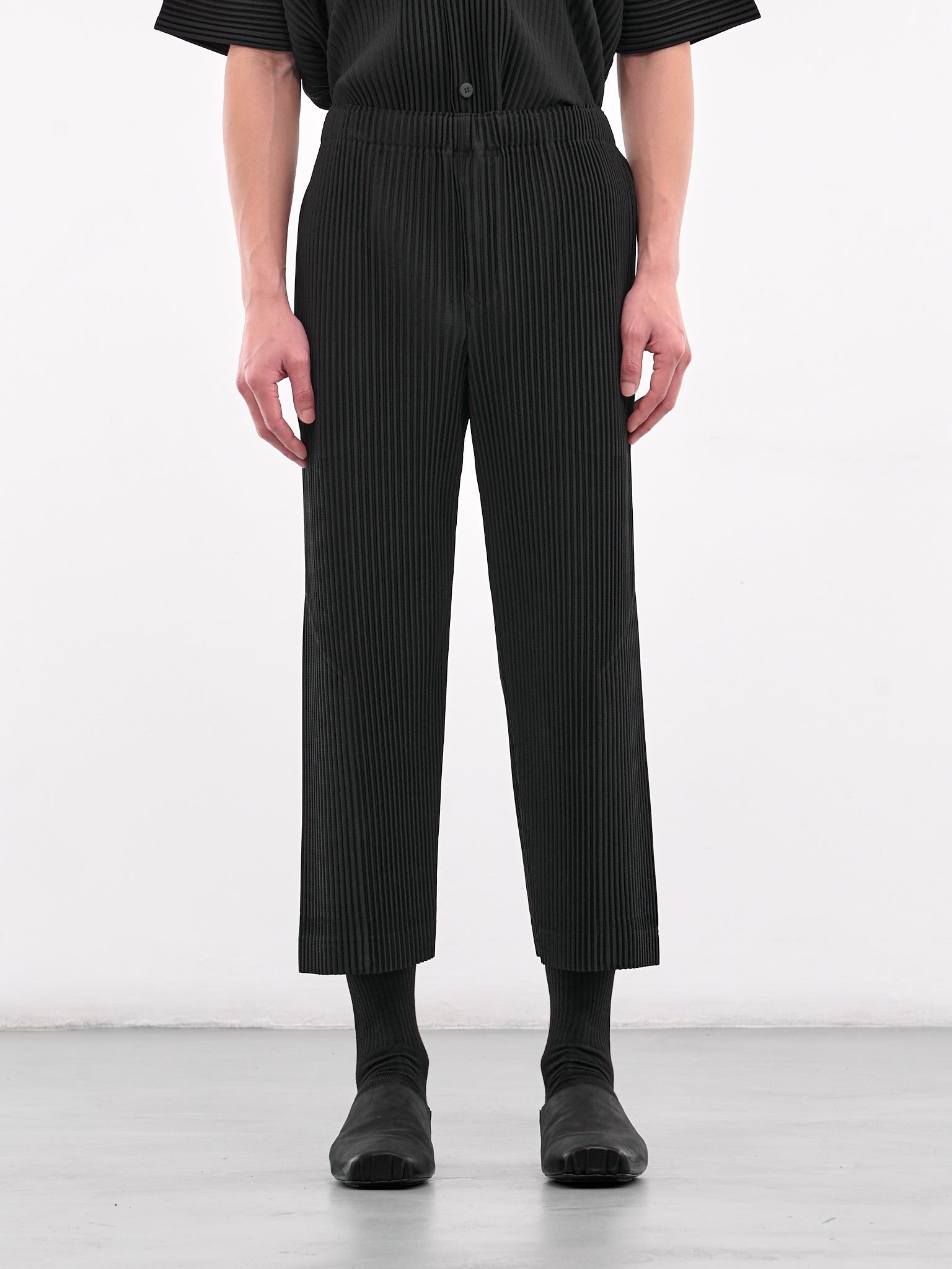 HOMME PLISSE ISSEY MIYAKE pants in black, paneled poly construction, signature pleated design, elasticated waistband, adjustable drawstring waist, button fly closure, side pockets, cropped length, straight leg, relaxed fit. Made in Japan 100% Polyester Japanese Sizing Model is 6'1" wearing size 2. Shoulders: 18" Chest: 36" Waist: 30"