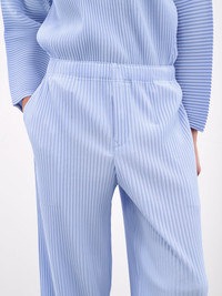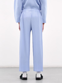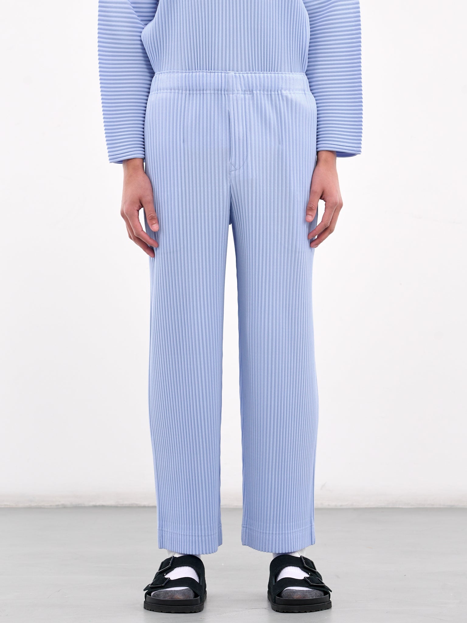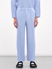 HOMME PLISSE ISSEY MIYAKE pants in mint green, signature pleated design, paneled polyester construction, all-over pleating, elasticated waistband, front concealed button fly closure, side pockets, tapered leg, relaxed fit. Made in Japan 100% Polyester Japanese Sizing Model is 6'2" wearing size 2. Shoulders: 19" Chest: 38" Waist: 29"