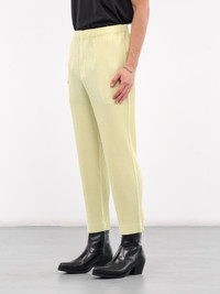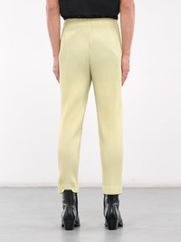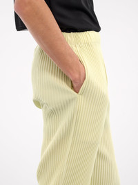 HOMME PLISSE ISSEY MIYAKE pants in green, signature pleated design, paneled poly construction, pleating throughout, elasticated waistband, mock-fly, side pockets, tapered leg, relaxed fit. Made in Japan 100% Polyester Japanese Sizing Model is 6'2" wearing size 2. Shoulders: 19" Chest: 38" Waist: 30"
