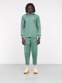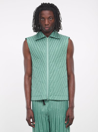 HOMME PLISSÉ ISSEY MIYAKE vest in green, padded vest design, quilted polyester construction, signature pleated style, spread collar, front exposed two-way zip closure, sleeveless, armscyes, side welt pockets, lined, straight hem, boxy fit. Made in Japan Outer: 100% Polyester Inner: 100% Polyester Filling: 100% Polyester Japanese Sizing Model is 6’2” wearing size 2. Shoulders: 19” Chest: 38” Waist: 28”