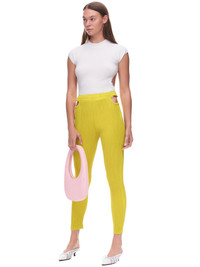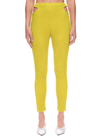 Pleats Please Issey Miyake pants in yellow, pleated design elasticated waistband, side cut out detail, side pockets, cropped hem, fitted. Made in Japan Japanese Sizing Composition: 100% Polyester Model is 5'11" and is wearing size 1. Bust: 32" Waist: 24" Hip: 35"