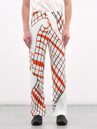 HOMME PLISSE ISSEY MIYAKE pants in white, paneled poly construction, signature pleated design, abstract graphic print, elasticated waistband, adjustable drawstring waist, button fly closure, side pockets, button vent cuffs, tapered leg, relaxed fit. Made in Japan 100% Polyester Japanese Sizing Model is 6'1" wearing size 2. Shoulders: 18" Chest: 36" Waist: 30"