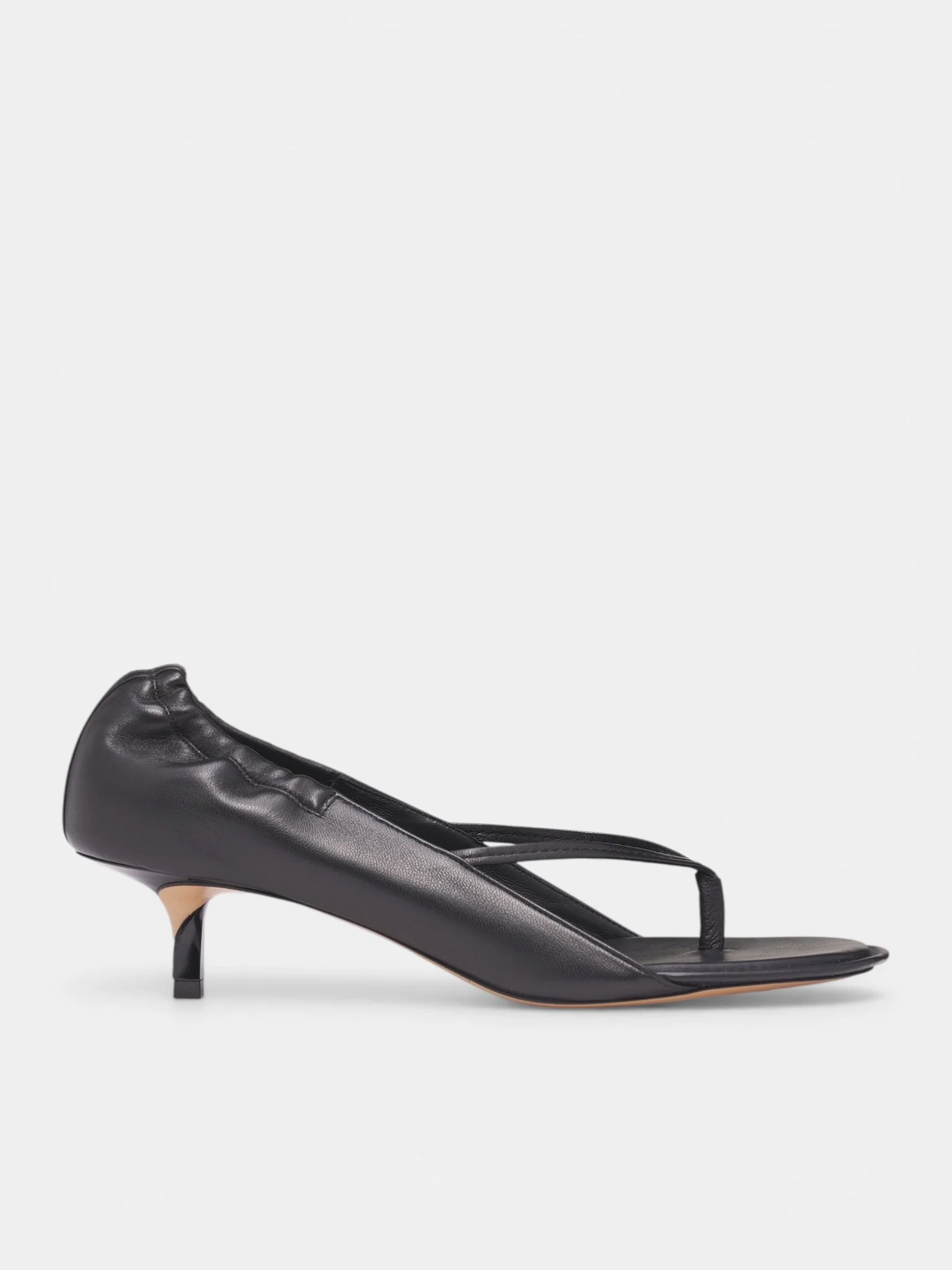 Thong heels in black constructed in nappa leather with a twisted kitten heel and thong strap. Featuring: • Lamb leather construction • Low-cut slip-on design • Round toe • Thong sandal strap • Elasticated heel • Asymmetric twisted kitten heel • Rond-Carre heel pads • Embossed logo at footbed • Made in Italy • 100% Lamb Leather | Outsole: 100% Cow Leather • Italian sizing