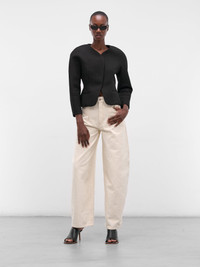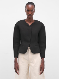 A cropped fitted jacket in bonded tailoring wool with a sculpted silhouette. Designed with rounded sleeves, jetted pockets, and a hidden button closure for a clean, minimal finish. Featuring: • Slim fit • Bonded tailoring wool construction • Collarless design • Cropped rounded sleeves • Hidden button closure • Fitted waist • Jetted pockets • Made in France • Main: 100% Polyester | Lining: 52% Viscose 48% Cotton • French sizing Model is 5'11" wearing size 36. Bust: 31.4" Waist: 24.8" Hips: 35"
