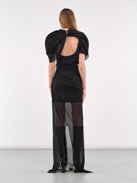 JACQUEMUS dress in black, layered chiffon construction, sheer, all-over draping, asymmetric neck, short sleeves, back clasp closure, back cut-out, back vent, layered hems, floor-length, relaxed fit. Made in Portugal French Sizing Model is 5'9" wearing size 36. Bust: 32" Waist: 23" Hips: 34"