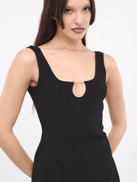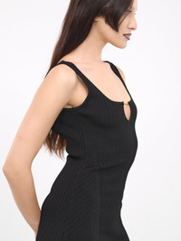 JACQUEMUS dress in black, viscose-blend rib-knit construction, scalloped neckline & hem, fixed shoulder straps, sleeveless, armscyes, open back, front metal logo plaque & cut-out, straight hem, mini-length, slim fit. Made in Portugal 88% Viscose 12% Polyester French Sizing Model is 5'8" wearing size 34. Bust: 32" Waist: 26" Hips: 34.5"