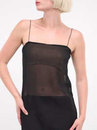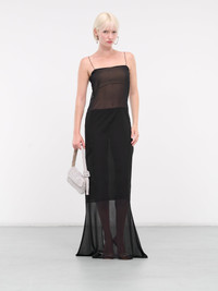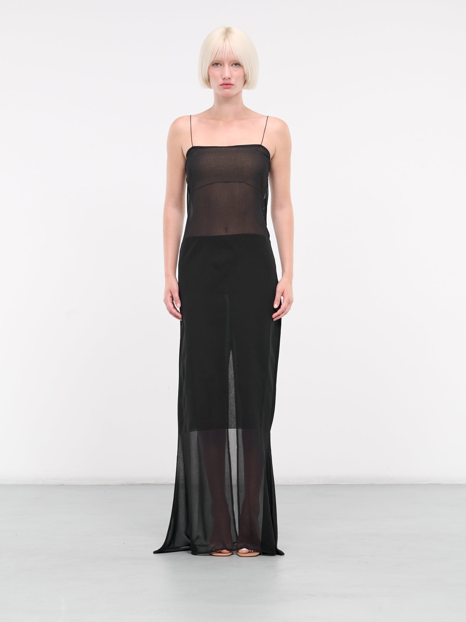 JACQUEMUS dress in black, layered design, paneled sheer mousseline construction, spaghetti straps, straight neckline, sleeveless, armscyes, back button fastening, high-waisted midi skirt underlay, straight hem, maxi-length, relaxed fit. Made in Romania 100% Polyester French Sizing Model is 5'9" wearing size 34. Bust: 32" Waist: 24" Hips: 34"